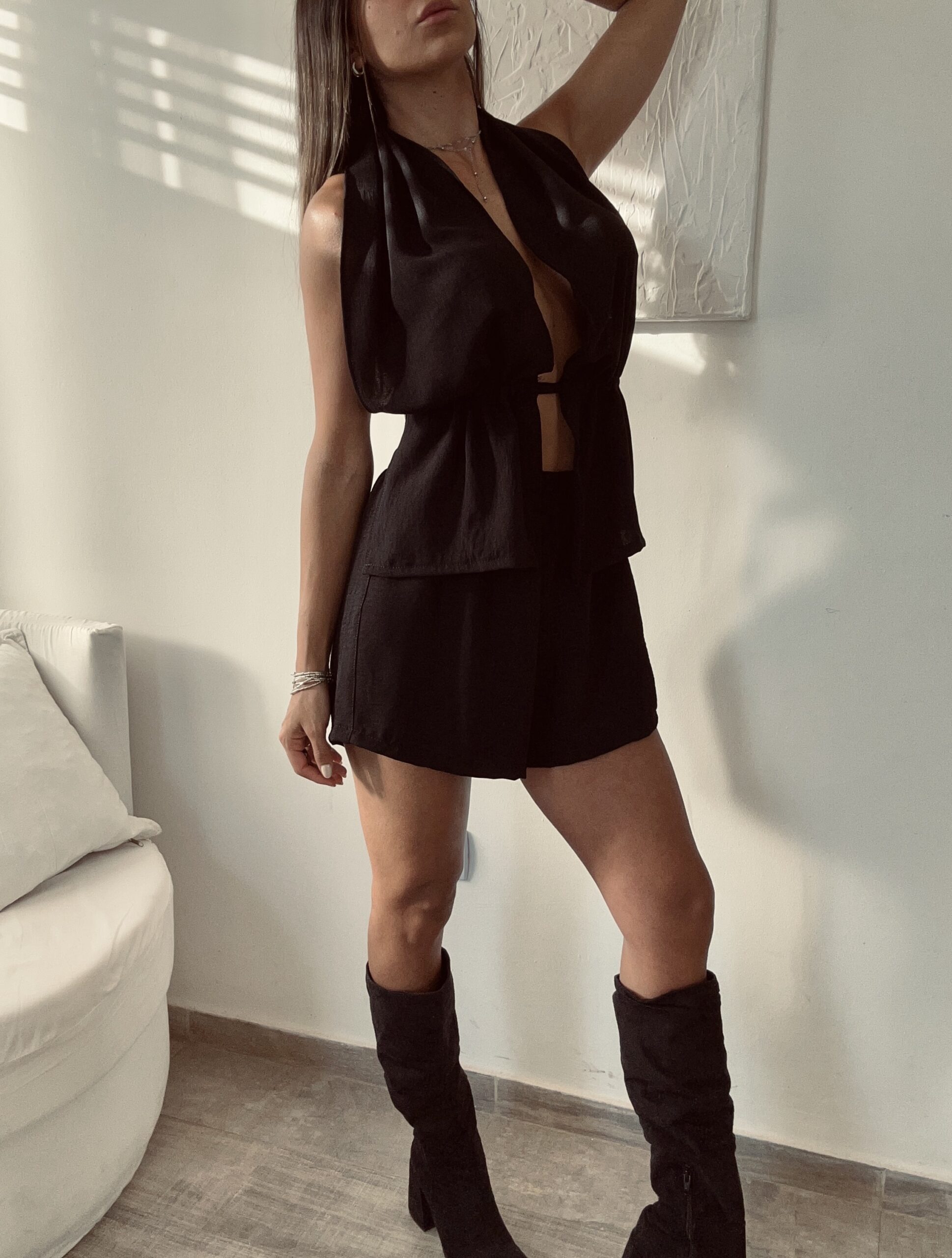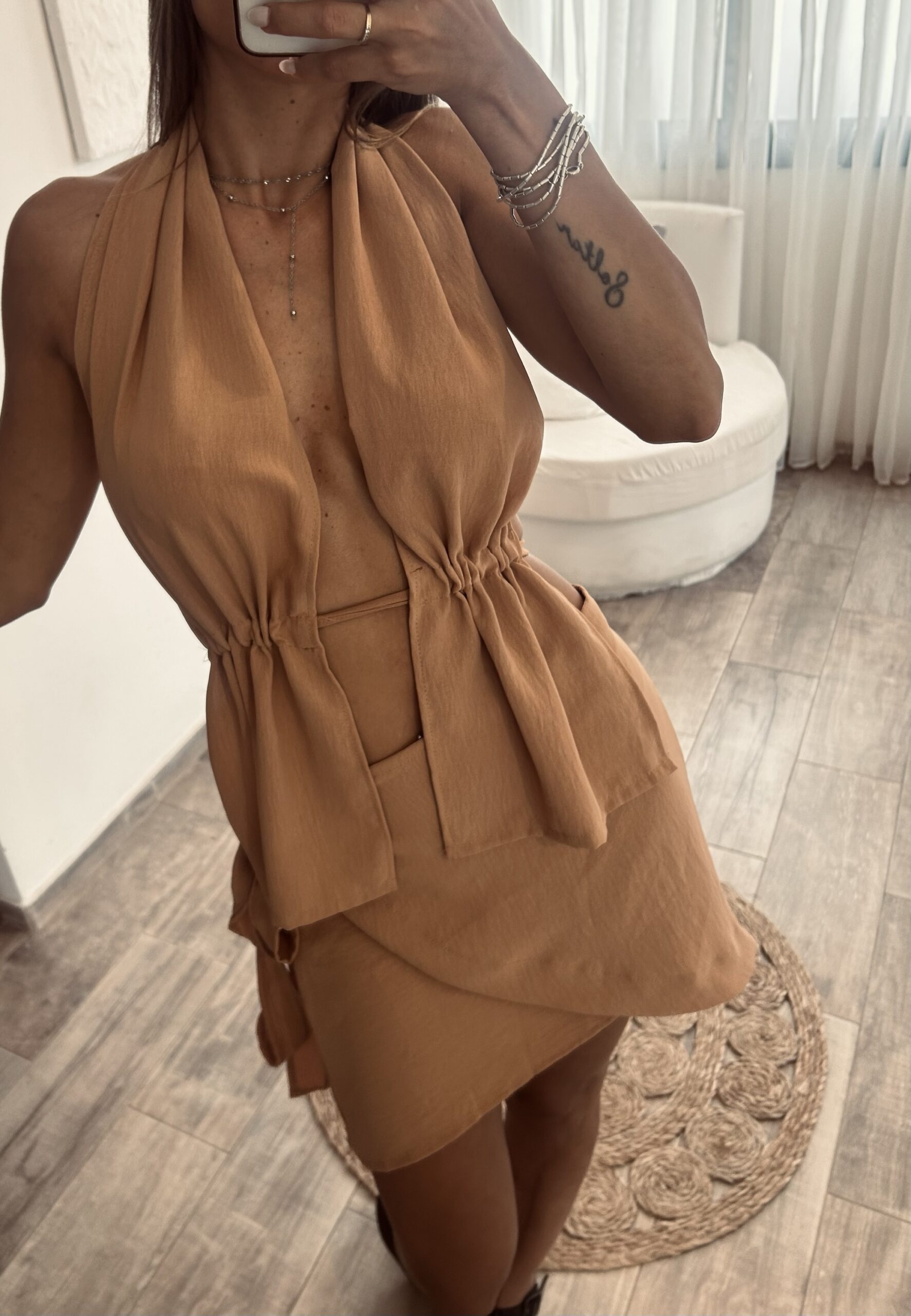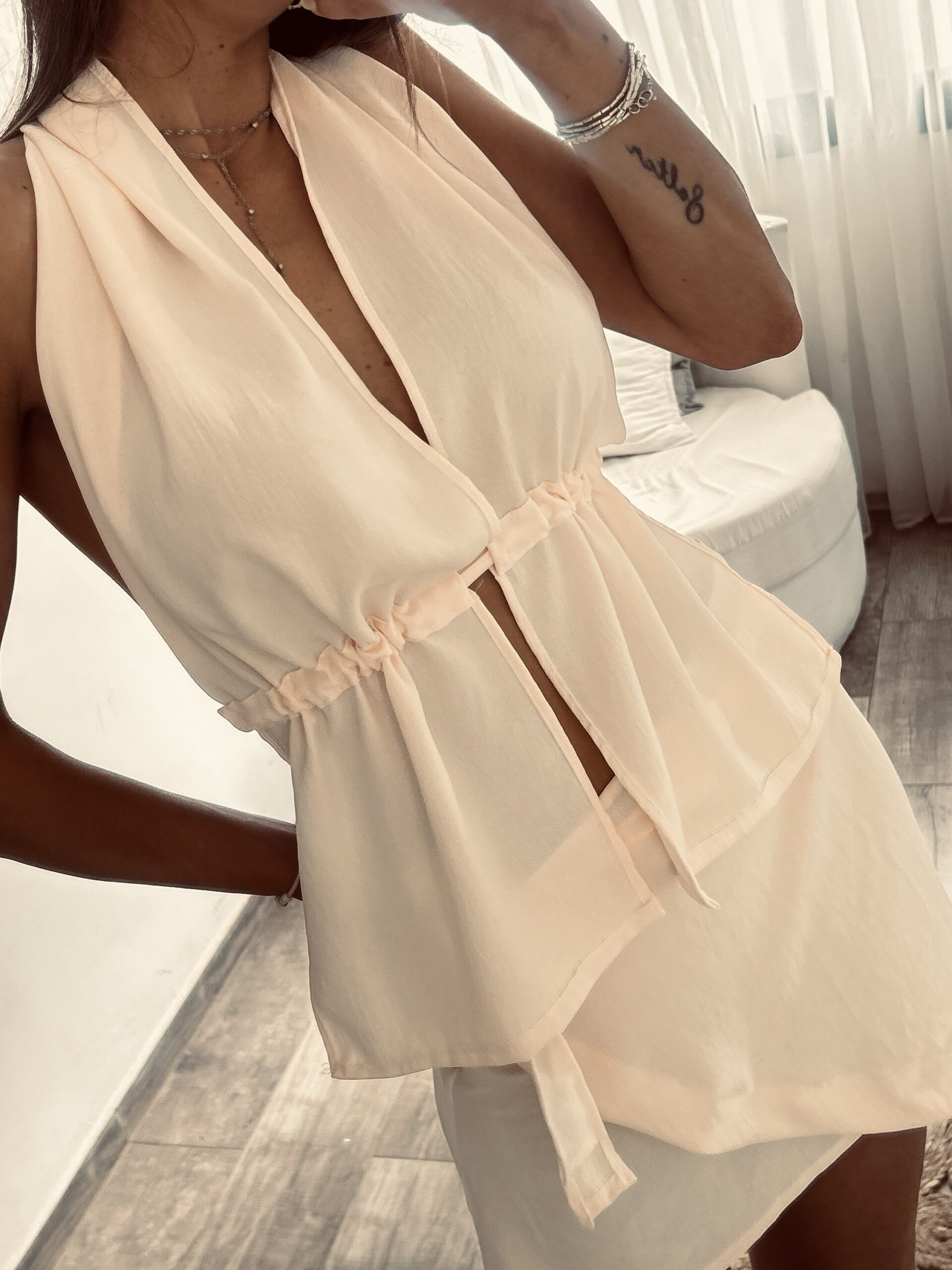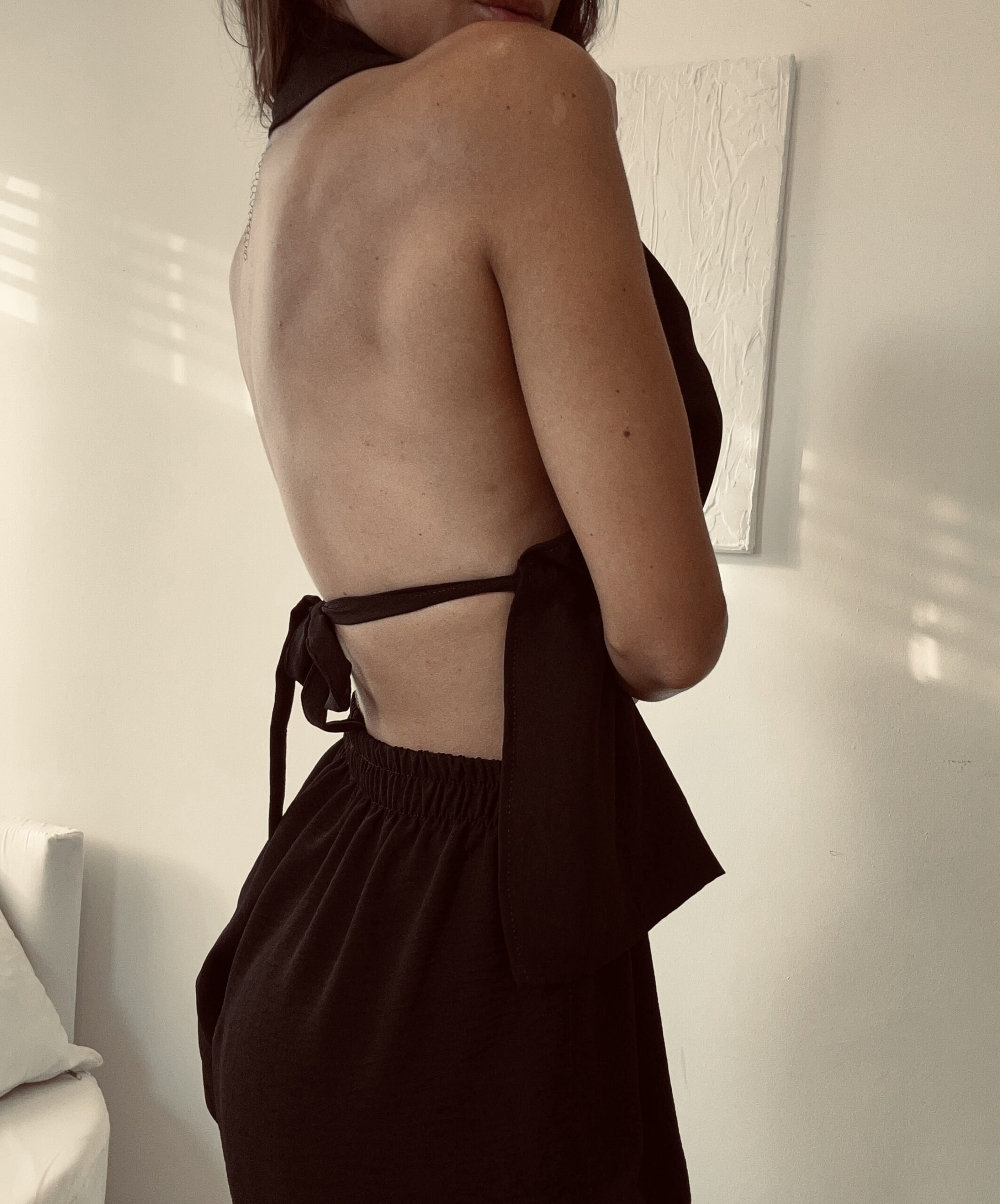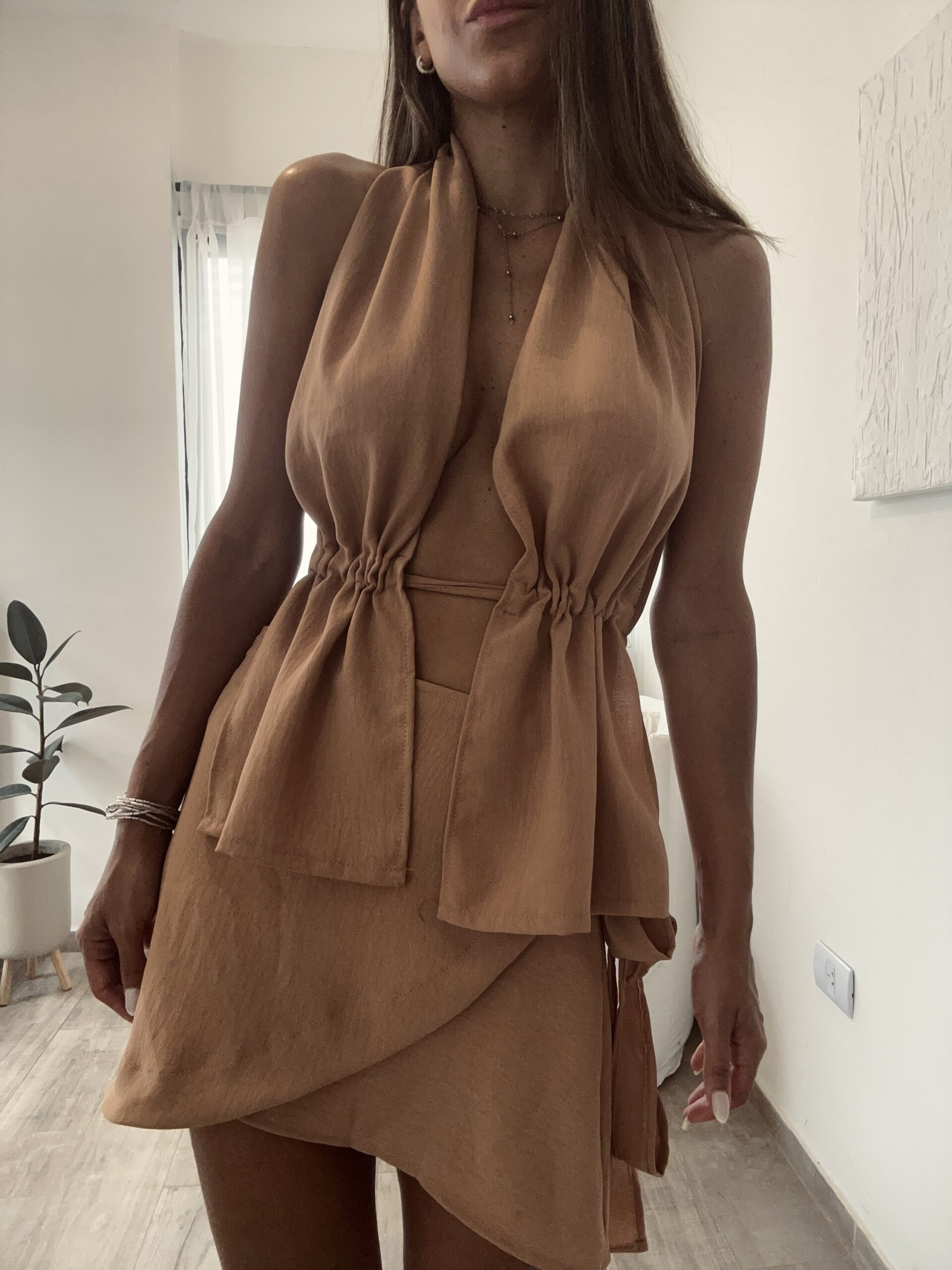 Detalle con tira para ceñir a gusto de cada una , tiene tiras que se atan en espalda .